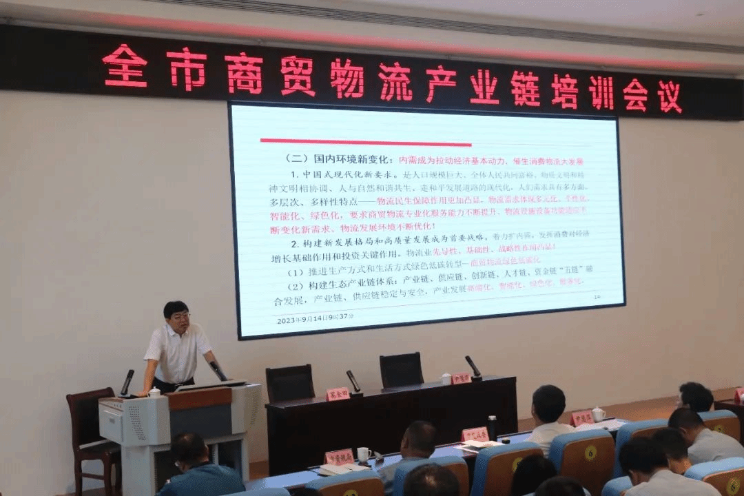 会议邀请av解说中文字幕博士生导师、山东物流发展研究中心主任、山东省决策咨询委员会专家库首批专家葛金田教授授课。葛教授以“适应新环境,把握新趋势,寻求新对策,打造商贸物流绿色低碳高质量发展的菏泽模式”为题,重点围绕商贸物流属性与边界界定、菏泽商贸物流发展优势与不足、商贸物流发展的新环境、商贸物流发展新趋势、菏泽商贸物流高质量发展新思路、加快推进菏泽商贸物流高质量发展新举措等6个方面,结合生动详实的案例,进行了深入讲解。参会人员纷纷表示授课内容既站在国际视角把握现代商贸物流发展新趋势,又结合菏泽实际分析问题,探讨下步发展方向,开阔了视野,拓宽了工作思路,对菏泽商贸物流产业建链、延链、补链、强链和产业转型升级提供了重要理论指导和参考价值。