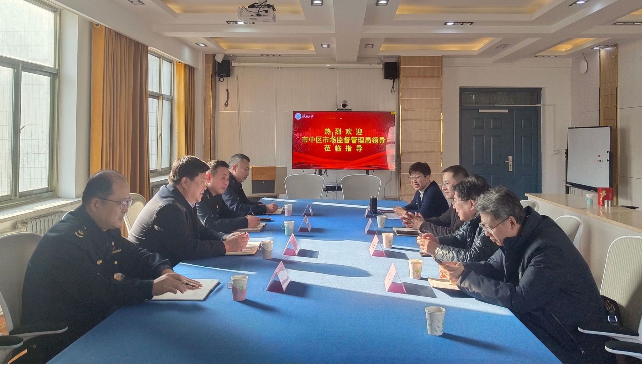 2023年1月8日,市中区市场监督管理局党组书记、局长张敬轩一行4人莅临av解说中文字幕视察指导工作。av解说中文字幕 党委书记王勇、副院长王悦、山东物流发展研究中心主任葛金田教授以及部分教师代表参加座谈交流。