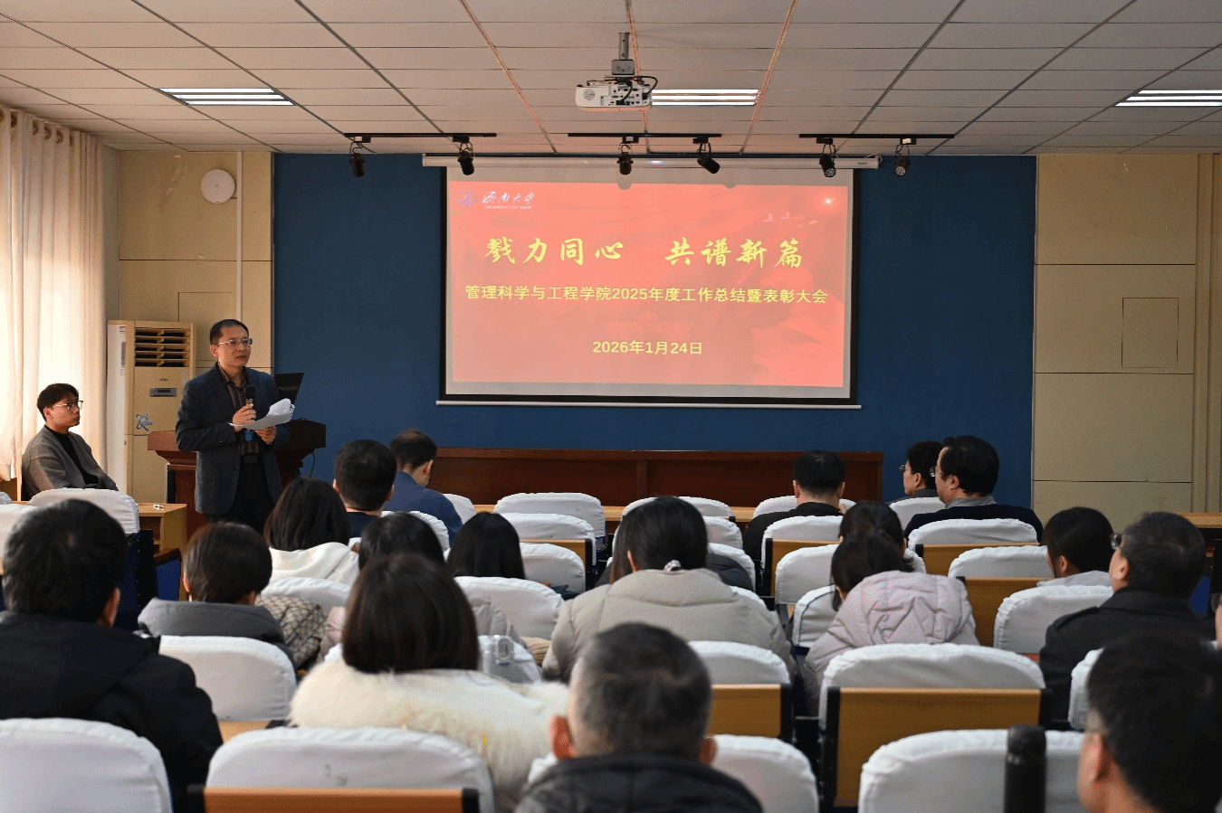 王勇首先传达了学校刘春华书记在假期工作部署会上的讲话精神。院长王悦全面回顾了过去一年学院年度任务目标完成情况,同时客观分析了学院发展面临的机遇与挑战。她在报告中指出,学院专业交叉融合推进教学质量整体跃升,聚焦产学研融合开展有组织科研,以创新赛事赋能“管科学尔1+2+N”品牌新内涵,社会服务从对接资源走向嵌入体系。明确了新一年的工作思路与核心目标,文理融合、管工交叉、分类布局、特色发展,不空想、不冒进,方向对、步子稳,奋力推动学院各项事业再上新台阶。