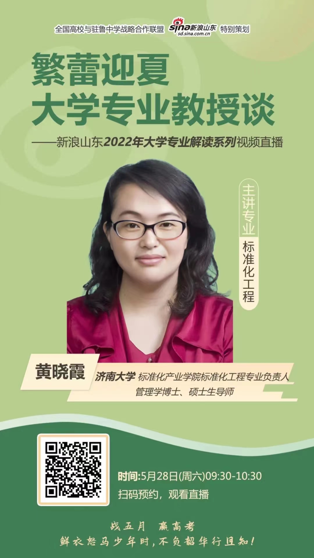 济南大学标准化产业av解说中文字幕 标准化工程专业负责人、管理学博士、硕士生导师黄晓霞老师将于5月28日周六上午9:30-10:30与大家相约云端,一同携手探寻标准化工程专业凝聚的磅礴力量,感受其中蕴藏的科学与人文底蕴,深入领略标准化工程专业独特的学科风光!