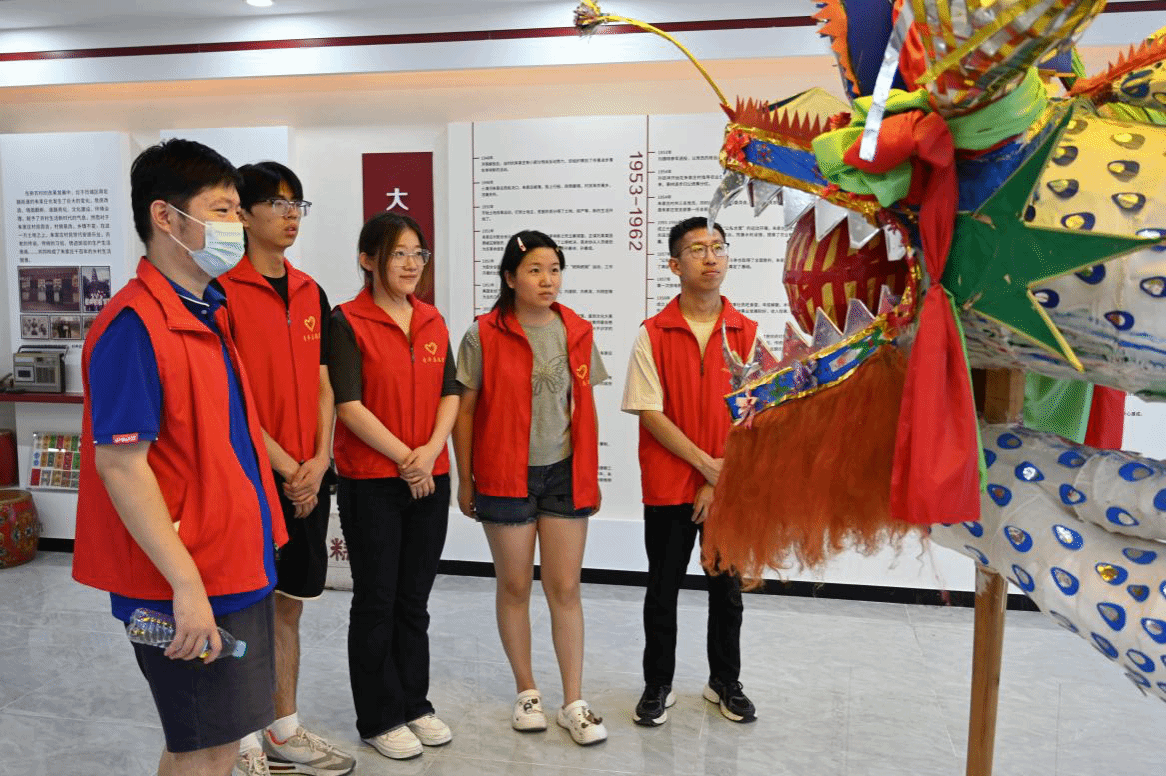 实践团成员深入村庄肌理,探寻到村非遗工坊,在这里陈列着象征“龙佑乡土”精神图腾的竹编龙身、彩绘龙头等传统舞龙道具,朱家庄舞龙已成功融入文体融合的发展模式,在村五人制足球场边,激昂的舞龙表演与“村超”的呐喊同频共振,成为“体育+民俗”的亮眼名片。