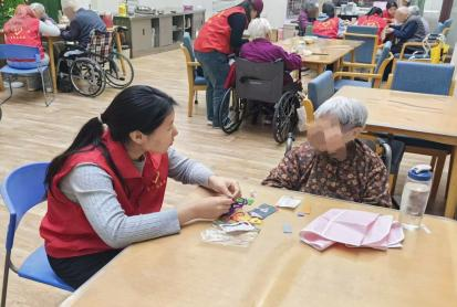 活动现场,护理院已提前备好剪裁规整的布料、色彩鲜亮的棉线、香料包等全套材料。志愿者们与老人并肩而坐,手把手协助完成创作。他们细心调整老人的持针姿势,耐心扶正布料位置,配合老人的动作节奏缓缓推进缝制流程。老人们神情专注,指尖在布料上起落,有的老人凭借过往针线活基础快速上手,将虎耳、虎眼缝得规整别致;其他人则在志愿者的辅助下,一步步完成锁边、填充、封口等步骤。当一个个憨态可掬的虎头香囊成型,淡淡的药香与融融暖意交织,老人们细细端详着自己的作品,眉眼间满是成就感与欣慰。活动过程中,志愿者们静静倾听老人分享过往的生活趣事,陪伴的时光在专注的创作与无声的默契中悄然流淌。